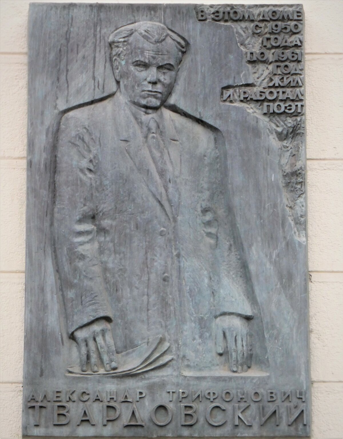 Установлена на здании (Кутузовский пр., д. 1/7), где жил А.Т. Твардовский.